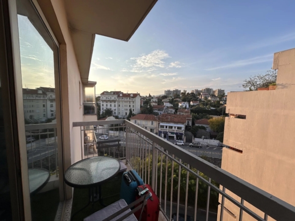 We present to you this bright studio of 27 m², located on the 5th floor of a secure residence. This property consists of an entrance hall with a closet, a bathroom with WC, a fully equipped kitchenette, and a pleasant living area opening onto a private balcony.