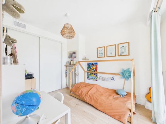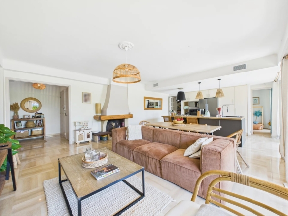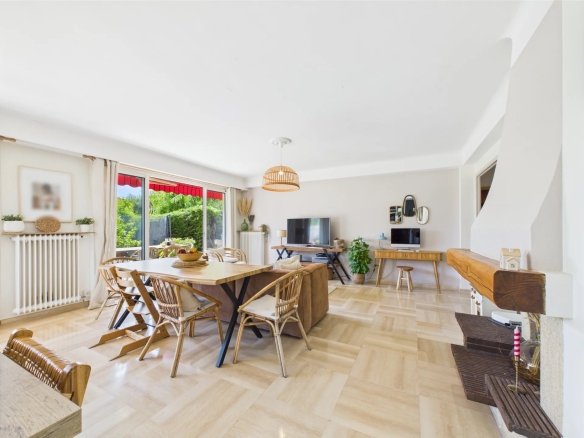 L’appartement s’ouvre sur une entrée avec dressing, menant à une pièce de vie lumineuse de plus de 40 m², comprenant une belle cheminée, ainsi que deux larges baies vitrées coulissantes offrant un accès direct à une vaste terrasse prolongée par un jardin privatif de 215 m².