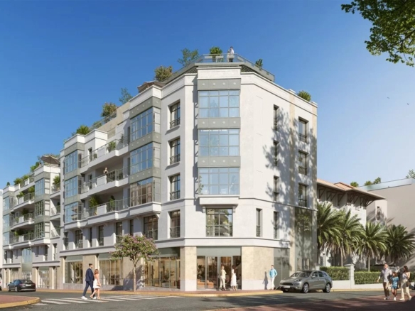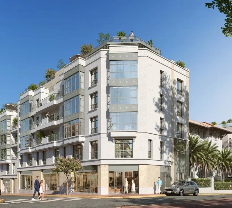 Façades en pierre naturelle, oriels contemporains, terrasses privatives jusqu’à 233 m², domotique intégrée et parking souterrain privé.