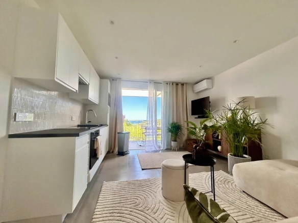 Une pièce de vie lumineuse avec cuisine ouverte équipée, donnant sur la terrasse,