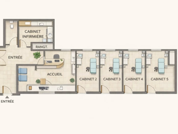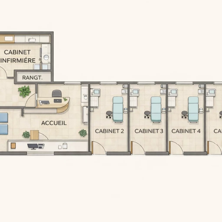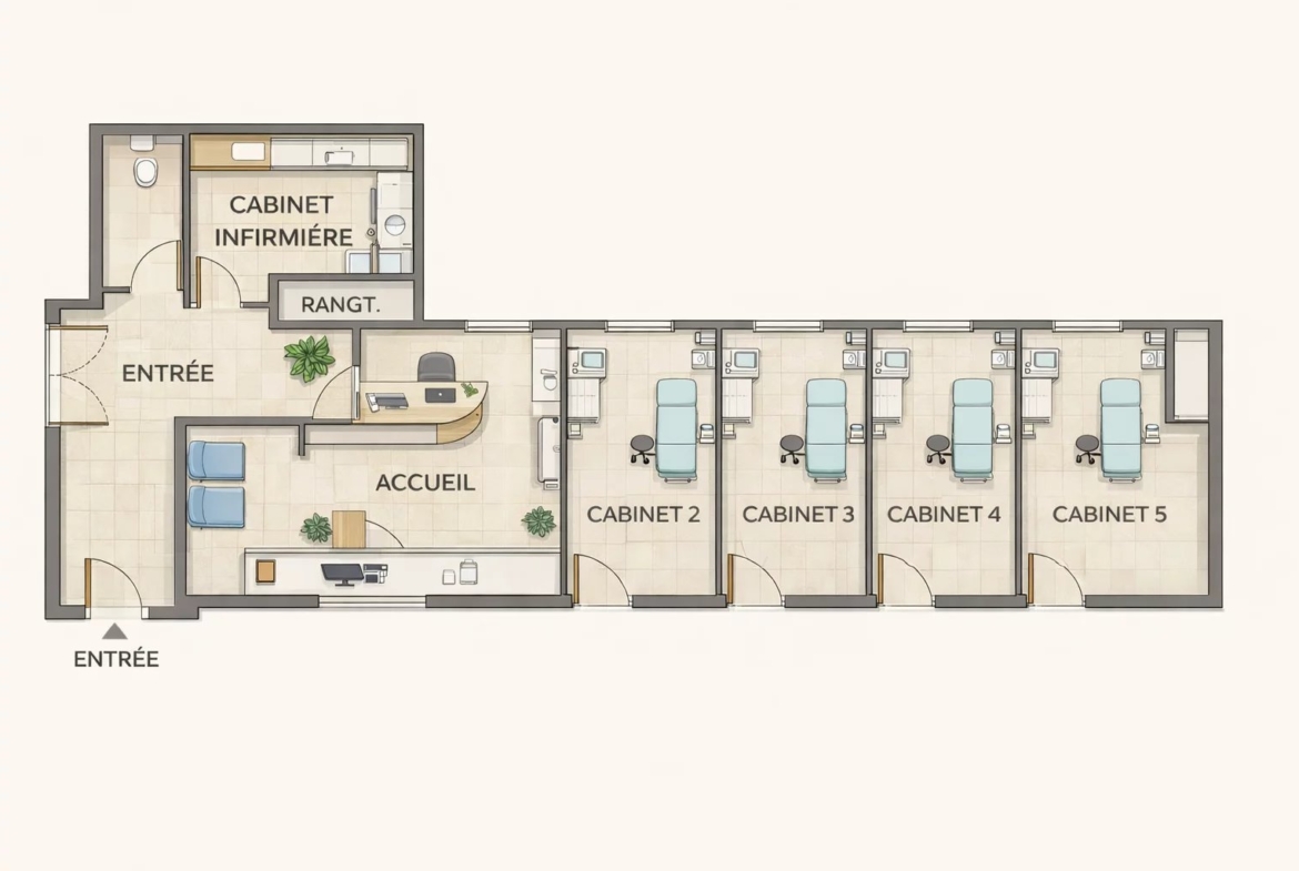 🚪 5 cabinets indépendants, permettant un partage d’activité ou l’installation de plusieurs praticiens