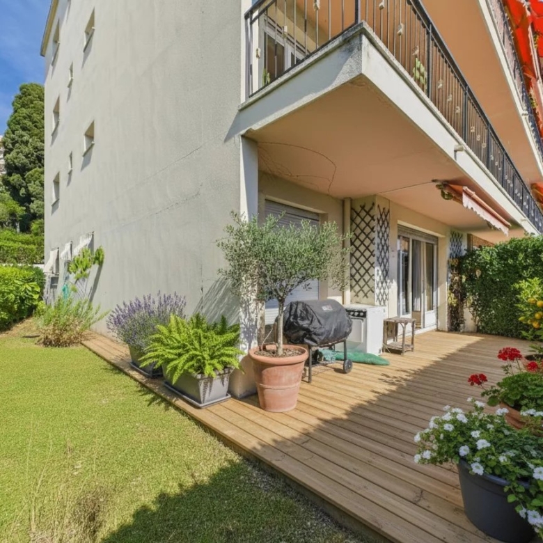 Antibes – Quartier Mont Saint-Jean – 3 pièces en rez-de-jardin surélevé avec terrasse, jardin et garage