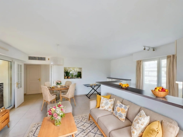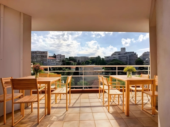 L’appartement se compose d’un séjour lumineux ouvert sur une magnifique terrasse circulaire de trente-six mètres carrés.