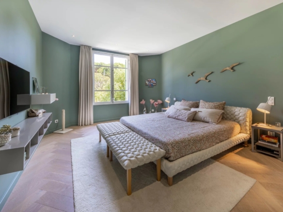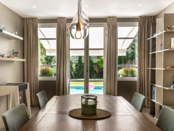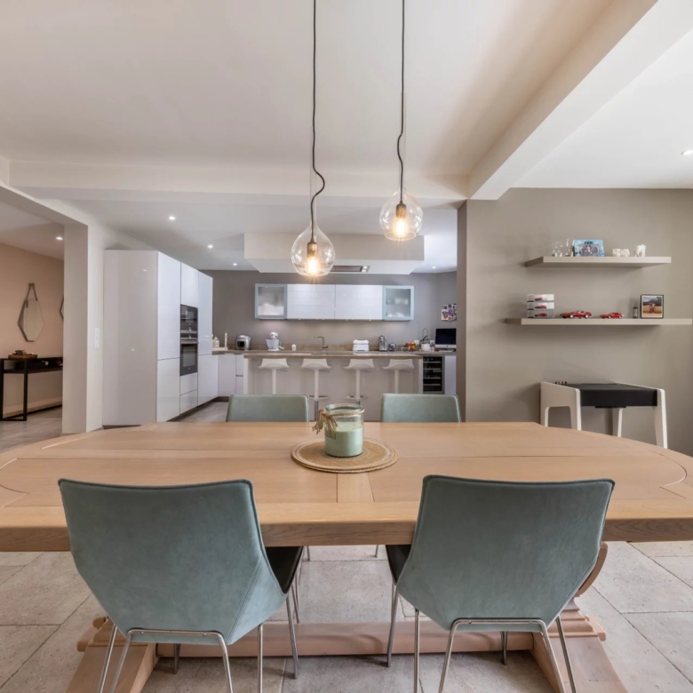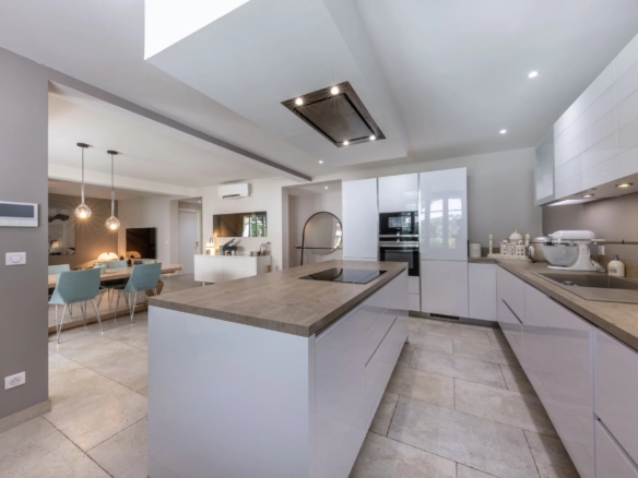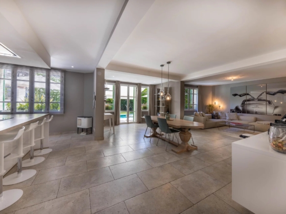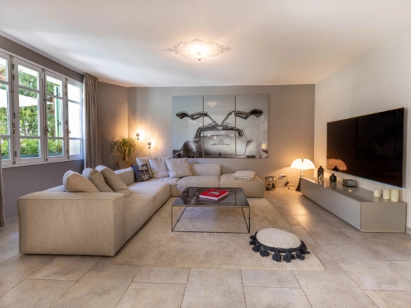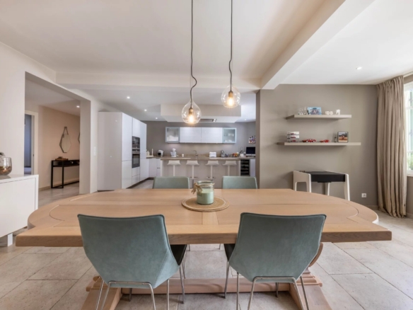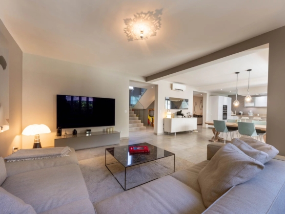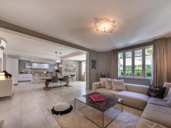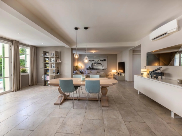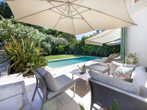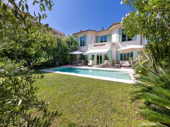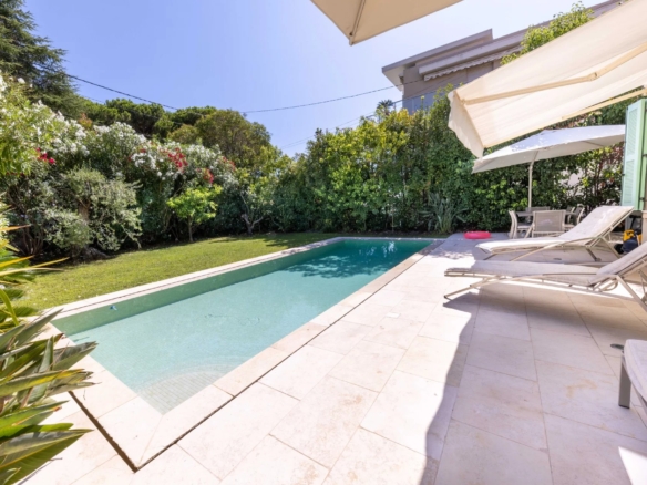Cette superbe villa rénovée avec soin est située dans le quartier de Rostagne à Juan les Pins, offrant un espace de vie élégant et confortable. Avec une superficie d’environ 200 m², la villa est établie sur un terrain plat de 586 m² agrémenté d’une piscine, créant ainsi un cadre idyllique pour profiter des beaux jours. L’emplacement de la villa garantit la tranquillité tout en étant à distance de marche des plages et du centre-ville animé de Juan les Pins.